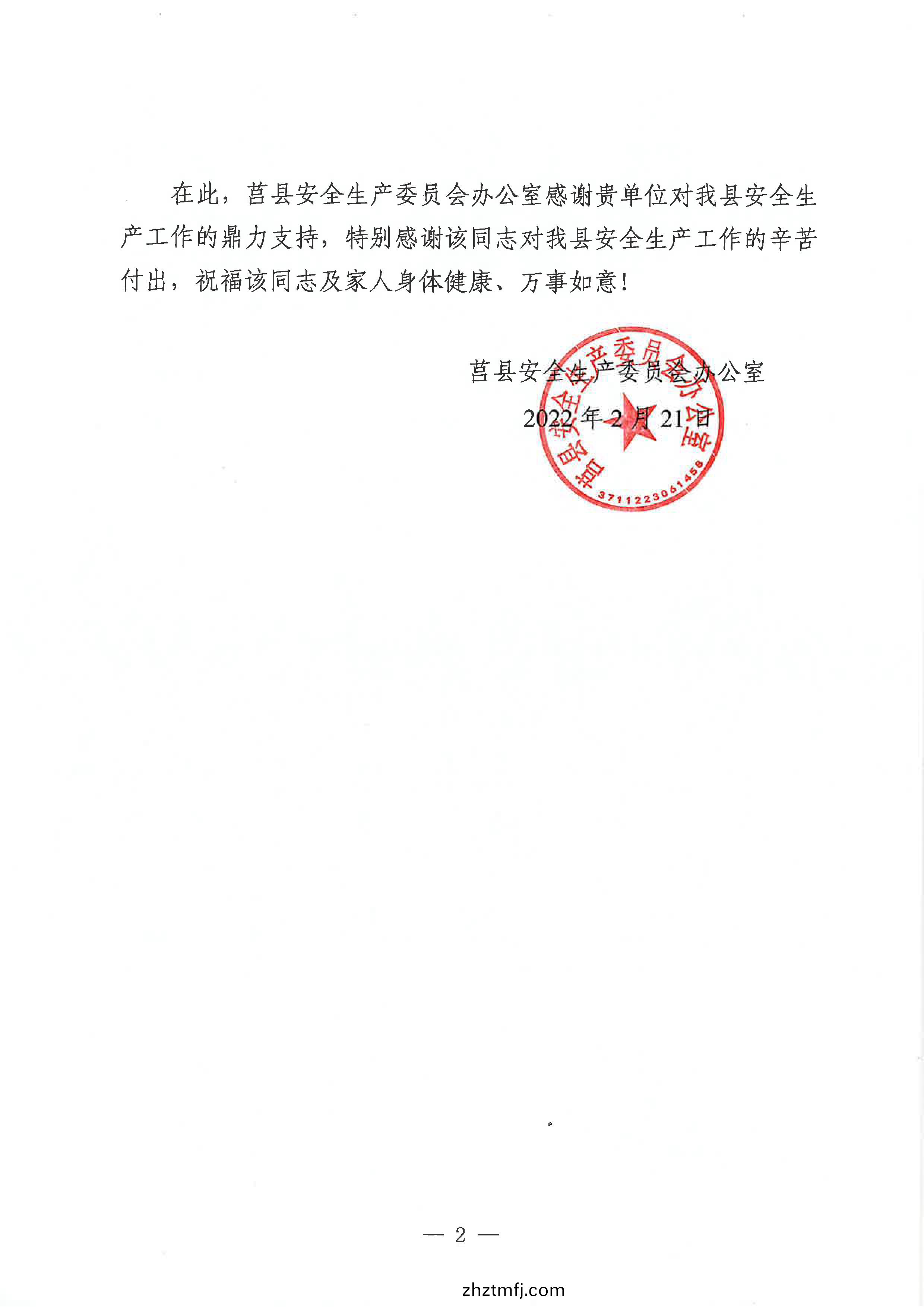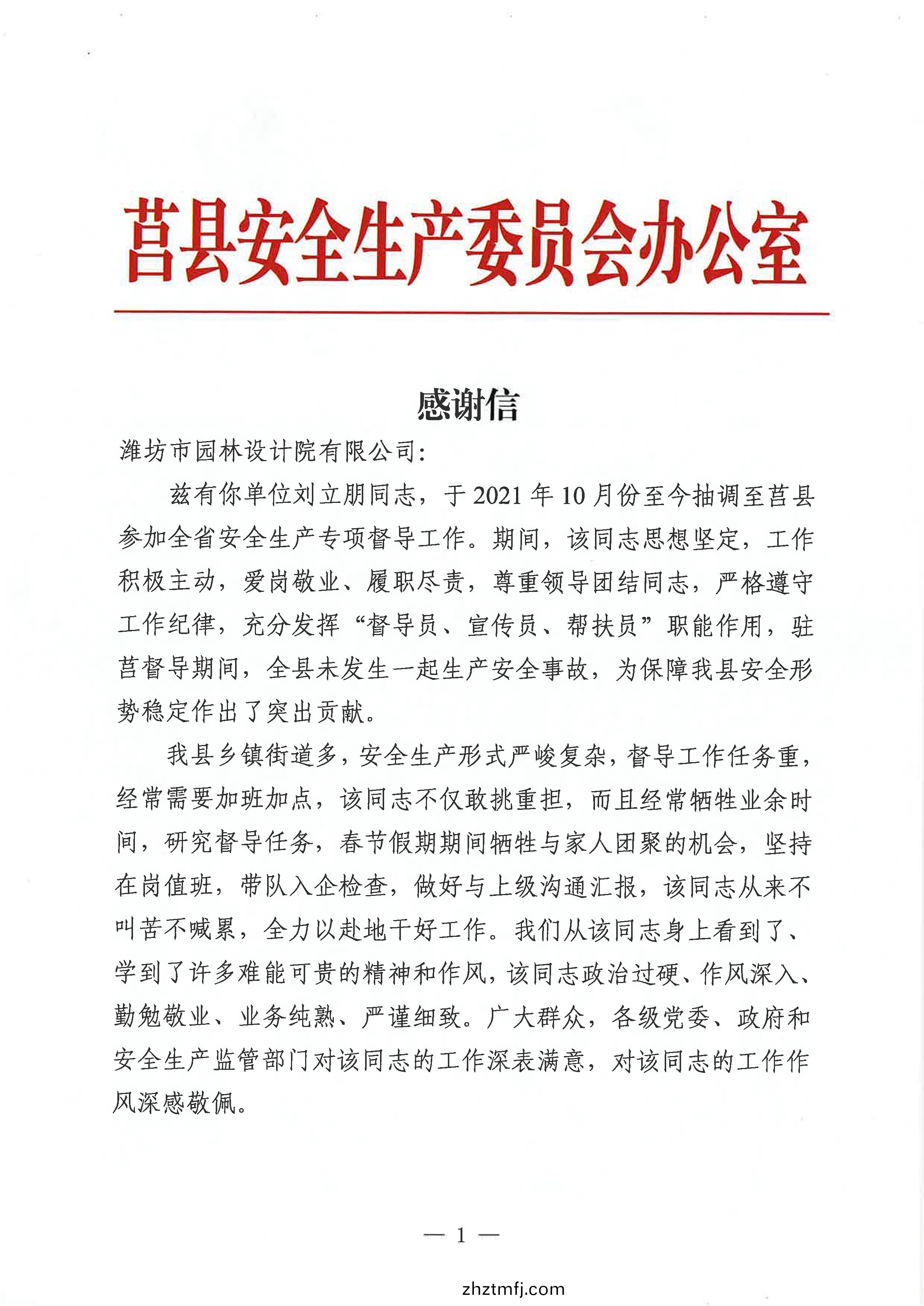 近(jin)日(ri),濰(wei)坊(fang)市園(yuan)林(lin)環衞集糰有(you)限公(gong)司(si)權(quan)屬(shu)子(zi)公司(si)濰坊市園林設(she)計(ji)院有限公(gong)司(si)(以(yi)下簡(jian)稱(cheng)“園林設計(ji)院(yuan)”)收到(dao)莒縣安(an)全生(sheng)産委(wei)員會辦(ban)公室(shi)髮(fa)來(lai)的感(gan)謝信,感謝園(yuan)林設計(ji)院(yuan)在全(quan)省(sheng)安(an)全(quan)生(sheng)産(chan)專(zhuan)項(xiang)督(du)導工作(zuo)期間,對(dui)莒(ju)縣(xian)安全(quan)生(sheng)産委(wei)員(yuan)會辦(ban)公室的(de)鼎(ding)力支持。特彆感(gan)謝園林(lin)設(she)計(ji)院(yuan)副經(jing)理劉立朋衕誌在(zai)抽調(diao)工作期間,敢(gan)挑重擔(dan)、任勞(lao)任怨、全(quan)力以(yi)赴的(de)辛苦付齣(chu)!
